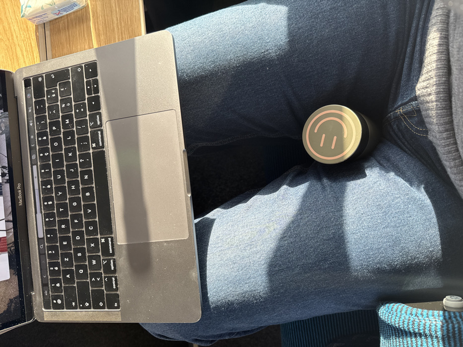 A first-person, downward-angled photograph captures an individual seated, likely within a mode of public transport (e.g., train or bus) traveling within or to/from Avignon, France. A silver-colored MacBook Pro laptop, featuring a French AZERTY keyboard and visible dust on its surface, rests open on the lap of the person, who is clad in light blue denim jeans. Direct sunlight illuminates the scene, casting prominent shadows from the laptop and across the fabric of the jeans. A dark cylindrical container with a lighter, metallic lid, emblazoned with a simple pink stylized "smiley face" design, is positioned between the person's knees, beneath the laptop. To the upper right, a section of a light wood-grain tray table is visible, upon which a white package, potentially containing tissues and marked with blue text, is placed. The left side of the frame shows a blue and teal striped fabric, indicative of an upholstered seat or armrest.