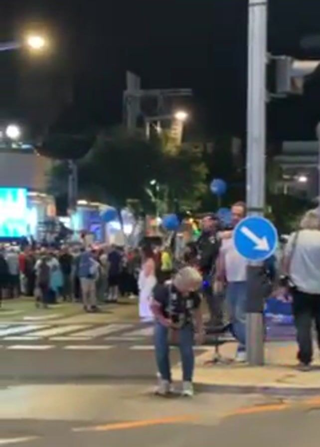 At night, a person is seen riding a four-wheeled motorized scooter at a crosswalk in front of a crowd. The street has traffic lights. There is a blue direction sign on a pole next to the crosswalk. Red and blue flashing lights are reflected in the street. A large sign is behind the crowd. Some people stand or walk at the crosswalk.