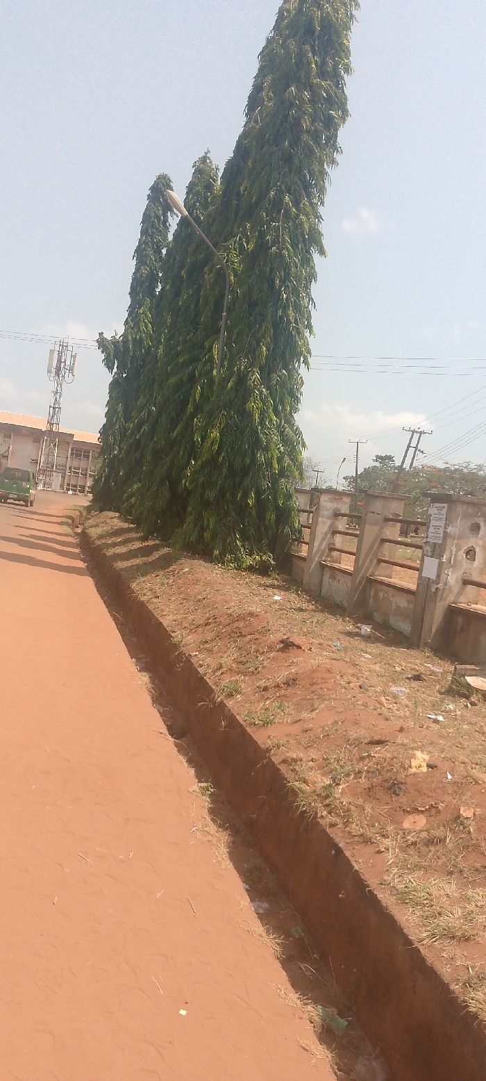 The image displays an outdoor scene in Nsukka, Nigeria, under a hazy, light blue sky. A reddish-brown unpaved dirt road dominates the lower left of the frame, bordered on its right by an excavated, rectangular dirt ditch. Parallel to the ditch, a line of at least four tall, slender trees with dense, dark green foliage, consistent with Polyalthia longifolia, extends into the midground. A streetlamp with a light-colored fixture is positioned within this tree line. The ground adjacent to the ditch and beneath the trees is composed of reddish-brown soil, interspersed with sparse dry grass and scattered refuse, including plastic items. In the midground, to the right of the tree line, a low, aged concrete and metal fence with horizontal bars is visible, showing signs of wear and dirt. Beyond this fence, utility poles with overhead power lines traverse the upper right background. Further left in the background, a multi-story building with a reddish roof and light-colored walls is partially visible, behind which stands a prominent, tall, lattice-style telecommunications tower equipped with antennae. A dark green vehicle, possibly a small bus or van, is partially visible on the road in the distance, near the building, facing away from the viewer. No individuals are discernible in the scene.