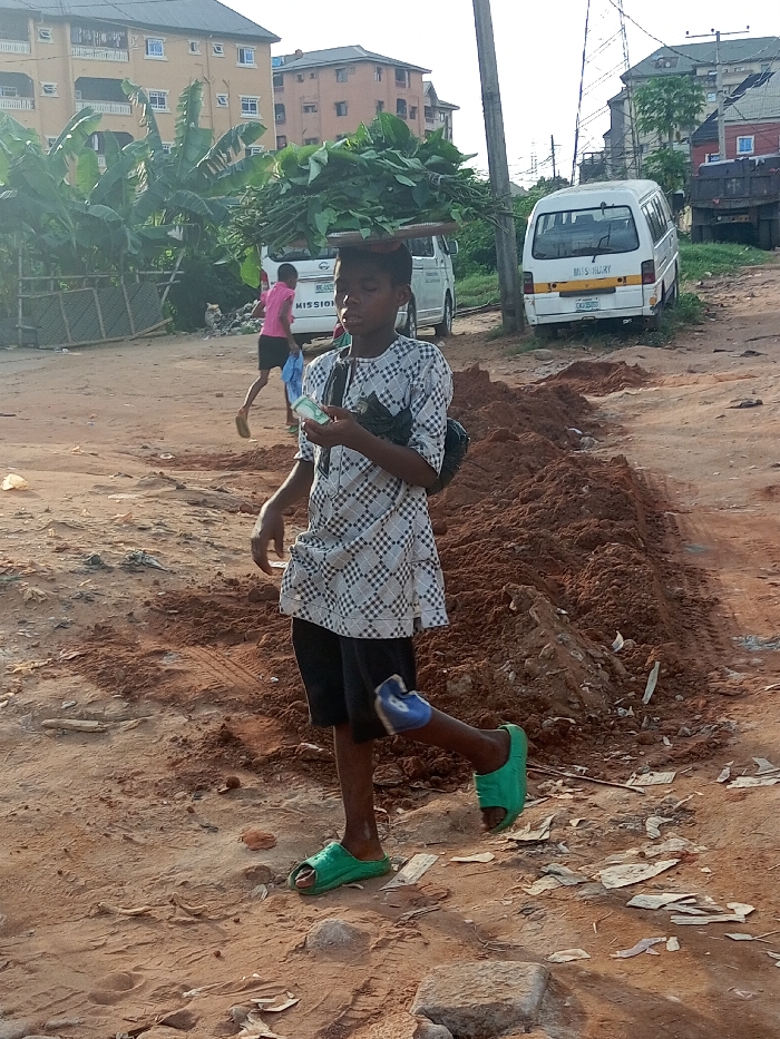 The scene is an unpaved, reddish-brown dirt road in Obosi, Nigeria, under natural daylight. A young individual, appearing to be a boy, is centrally positioned, walking left-to-right. They wear a light-colored, long-sleeved shirt with a checkered pattern, dark shorts, and mismatched slide sandals (green on the left foot, blue on the right). A circular tray piled with green leafy vegetables is balanced on their head. In their right hand, they hold several folded Nigerian naira notes, looking down at them. A dark satchel or bag is slung across their chest. To the left and slightly behind the main subject, another child in a pink shirt is visible, appearing to run. In the mid-ground, a long, irregular mound of excavated reddish-brown earth runs parallel to the road. Further back, two white vans are present; the closer one displays "MISSION" on its side, and the rear one has "MISSILARY" (likely a misspelling of "MISSIONARY") and a Nigerian license plate (EKJ-6950B). A dark utility truck is partially visible beyond the second van. The background includes multi-story residential buildings with various facades (yellow, light brown) and dense green foliage, including banana trees. A utility pole extends vertically on the right side of the frame. The ground shows tire tracks and scattered debris.