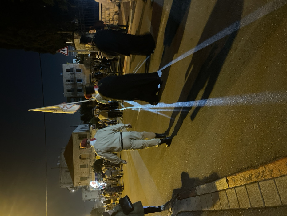 This nighttime image captures a street scene in an urban area of Haifa, Israel, characterized by older stone buildings. The scene is lit by artificial lights, casting distinct shadows on the asphalt road. In the mid-ground, a procession or gathering is in progress. A male figure, viewed from behind, occupies a central position, dressed in a light-tan uniform-like outfit, black boots, and a red fez-style hat with a white scarf around his neck. To his right, two additional figures, also seen from behind, wear long, dark robes and dark, traditional headwear. One of these figures carries a tall pole supporting a light-colored flag featuring a complex, star-like emblem. Numerous other individuals are visible further down the street, indicating a larger crowd or extended procession. In the background, multi-story buildings constructed of light-colored stone line the street. On the far right, a triangular road sign depicting two inverted arrows is present. On the far left, a person is partially visible, walking on or adjacent to the paved sidewalk, carrying a dark bag.