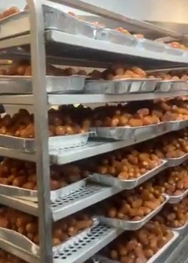 large metal rack filled with trays of small, brown, oblong pastries. The pastries are arranged neatly in individual aluminum foil trays. The rack has multiple shelves, each packed with these pastries. The camera pans upwards, showcasing the numerous layers of pastries. The scene then shifts to show a less-focused background of a workspace with a long counter, various boxes, and a pallet on the floor.