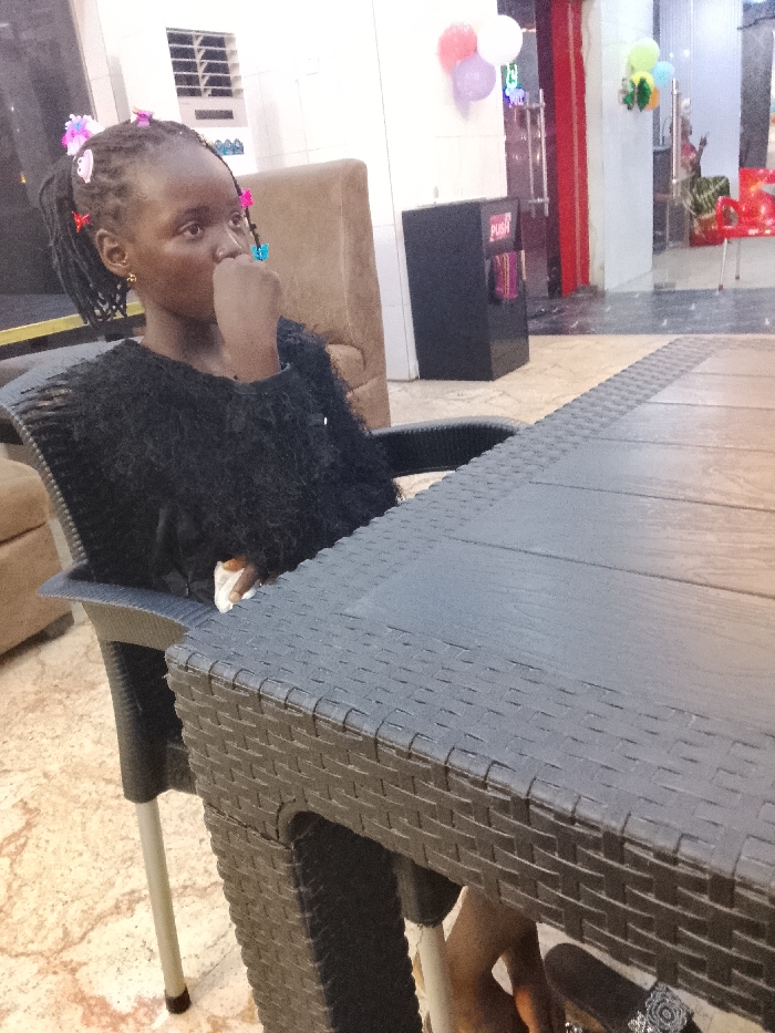 A young girl with braided hair adorned with colorful butterfly clips is seated at a dark wicker table. She wears a black fuzzy shirt and has her hand to her face in a thoughtful pose. In the background, there is a brown chair, a black vending machine, and a glimpse of red chairs. Balloons are visible near a glass door, suggesting a festive atmosphere. The lighting is dim, casting shadows across the room.