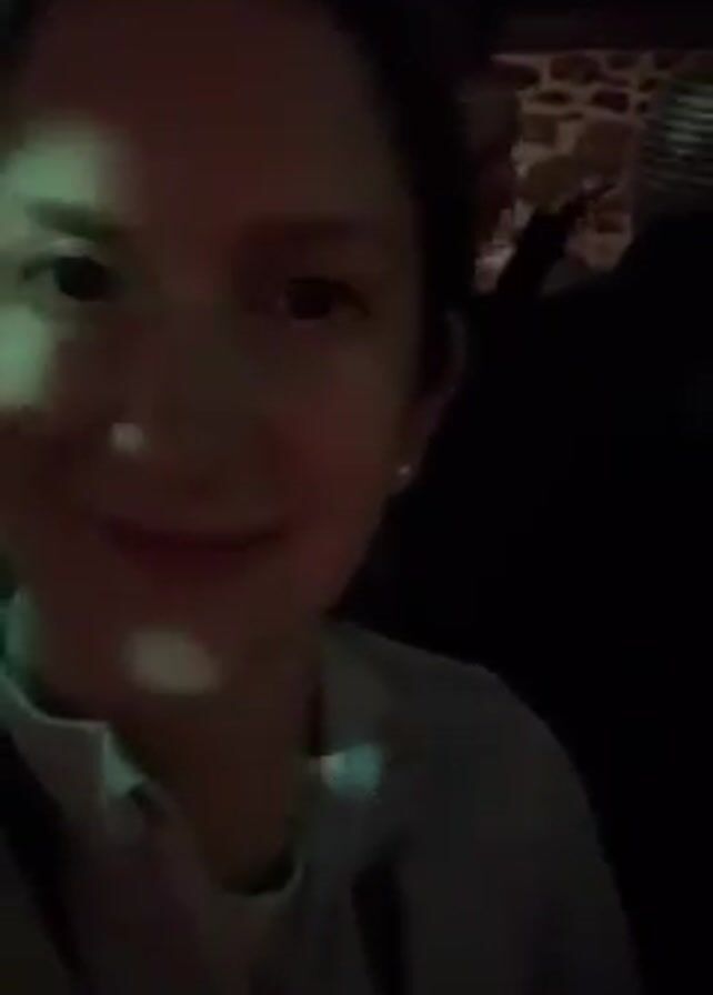 A woman is recording a video of herself, smiling and looking directly into the camera. The lighting is dim and the camera is close to her face. She is wearing a light-colored hooded sweatshirt and a lanyard is visible around her neck. The background is dark, but it appears she is inside a dimly lit room with people moving around behind her, and music playing in the background.