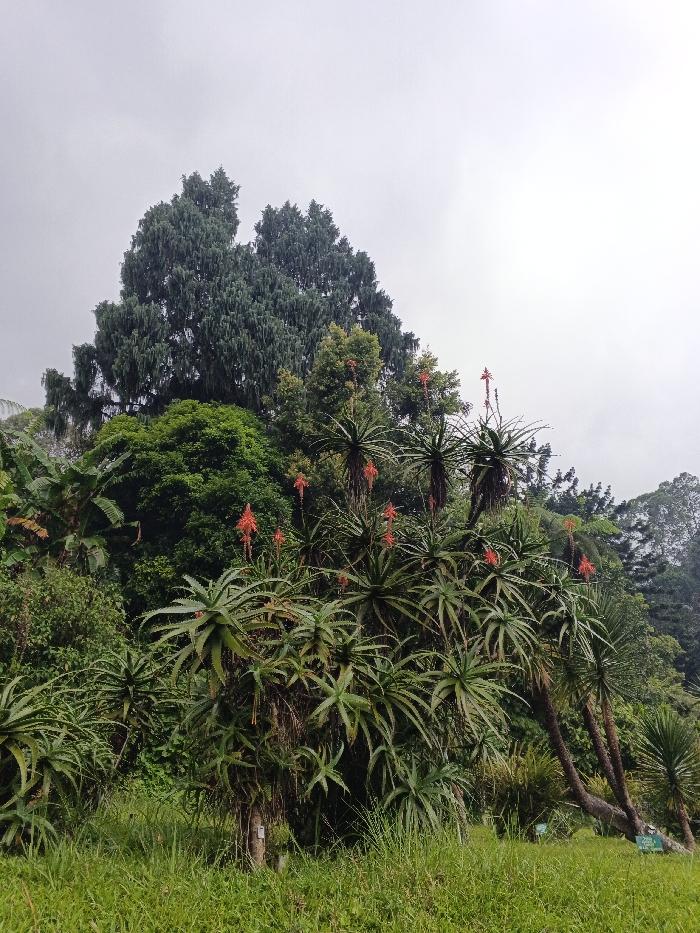 A lush landscape features a diverse array of plant life under an overcast sky. Tall evergreen trees tower in the background, accompanied by verdant deciduous foliage. In the foreground, several aloe plants with striking red flower stalks stand out, surrounded by thick, green grass. The scene evokes a sense of natural abundance and tranquility.