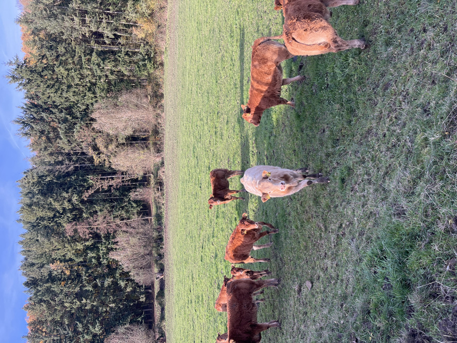 This image depicts a rural scene in Gangloff, Germany. The foreground and midground feature a herd of approximately ten to twelve cattle grazing on a green grass pasture. Most cattle are reddish-brown, while one prominent animal in the center foreground is a light beige or cream color, facing the viewer. This light-colored animal has a visible yellow ear tag in its left ear and appears to have mud on its lower legs. The cattle are dispersed across the field, with some standing and others appearing to walk. In the background, a dense line of trees forms a forest, comprising a mix of evergreen and deciduous trees, the latter showing autumnal leaf loss and some bare branches. The sky above is clear and blue. Natural daylight illuminates the scene, suggesting an outdoor environment under fair weather conditions. No human figures or structures are visible.