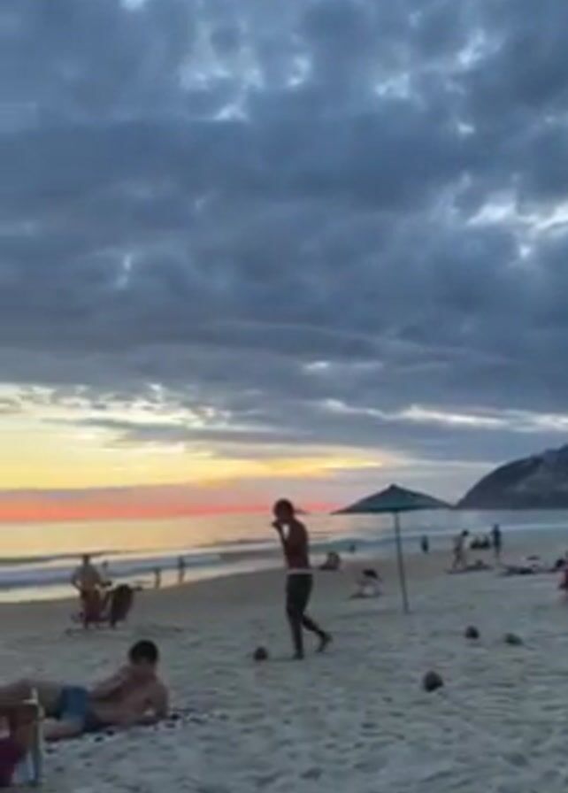 beach with people on it at dusk. The sky is filled with dramatic gray and white clouds, and the sun is setting, creating a colorful glow on the horizon. In the foreground, there are several people lounging on the sand, some in beach chairs, while others stand and watch the sunset. Some people are in the water, and a few children are playing. There's a bicycle resting near a beach chair. In the distance, a mountain range is visible. The overall atmosphere is relaxed and peaceful.
