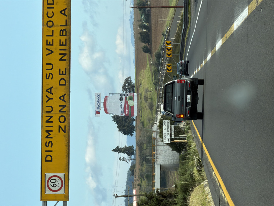 A highway scene shows a gray JAC pickup truck driving on the right lane, followed by a black car. A sign indicating "TRANSPORTE DE CARGA TRAMO CON RESTRICCIONES PRINCIPIA" is visible. On the left side of the road, a billboard displays a McCormick Mayonesa advertisement. Further ahead, a yellow sign advises drivers to "DISMINUYA SU VELOCIDAD ZONA DE NIEBLA" (reduce speed in fog zone) with a speed limit of 60 km/h. The landscape features green fields and trees under a partly cloudy sky.