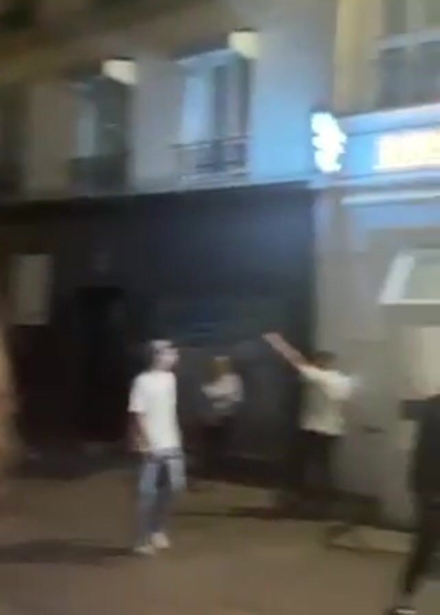 crowd of people gathered on a street at night. They are standing in front of a building with the sign "BELLFORT WC" visible above the entrance. Some individuals are walking around, and there appears to be some activity or commotion among the group, as voices can be heard. The setting is an urban environment with streetlights providing illumination, and the building is typical of city architecture.