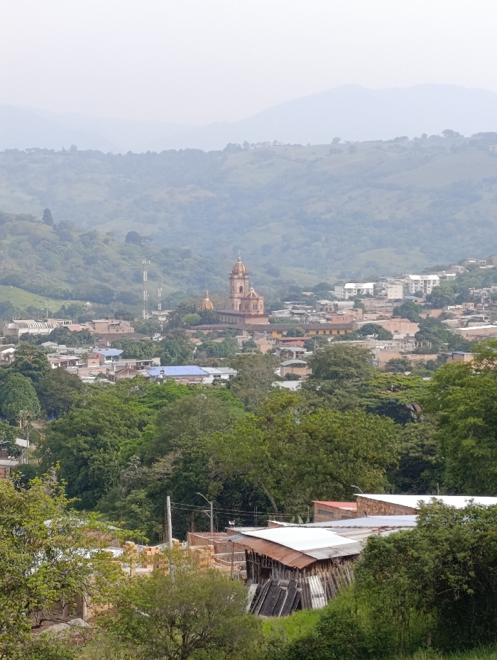 An elevated, panoramic view captures the city of Timaná, Colombia, under an overcast or hazy sky