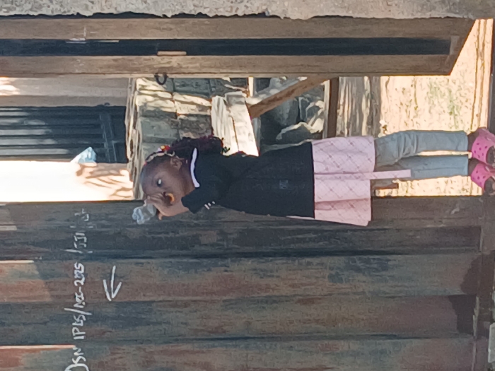 A young girl with dark hair and pink sandals is positioned horizontally. She wears a black top, a pink skirt, and gray leggings. She appears to be eating something while holding a clear water bottle. The background includes wooden planks, a stone wall, a window, and some vegetation. In the lower left corner, there's white writing on a wooden surface with an arrow pointing down. The photograph seems to have been taken at an unusual angle, possibly from a high vantage point.