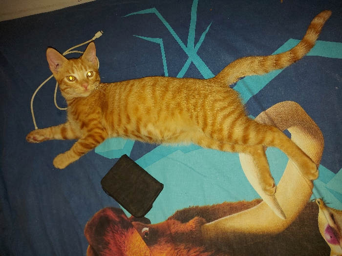 - "The image depicts an orange tabby cat lying stretched out on its back on a blue fabric surface" by FM-pNPMj1, licensed under CC BY 4.0