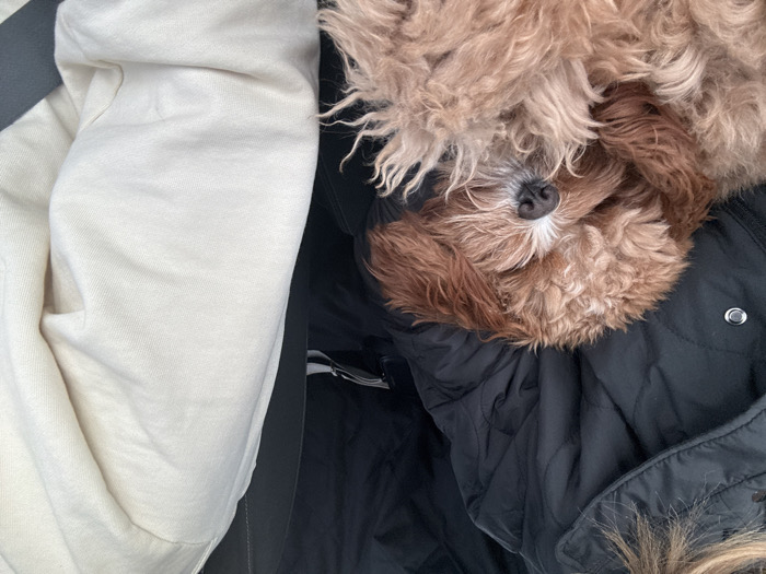 This image captures the interior of a vehicle located in Malko Tranovo, Bulgaria. A small, reddish-brown, curly-haired dog with white markings on its snout is observed sleeping or resting, curled upon the lap of an individual wearing a dark, quilted jacket. The dog's eyes are closed, and its snout is visible. The upper portion of the individual's light-colored hair is visible at the top left of the frame. To the right, a second individual is partially visible, dressed in a light-colored, likely cream, long-sleeved garment, with a dark seatbelt traversing their torso. The background environment is dark, consistent with vehicle seating and interior components.
