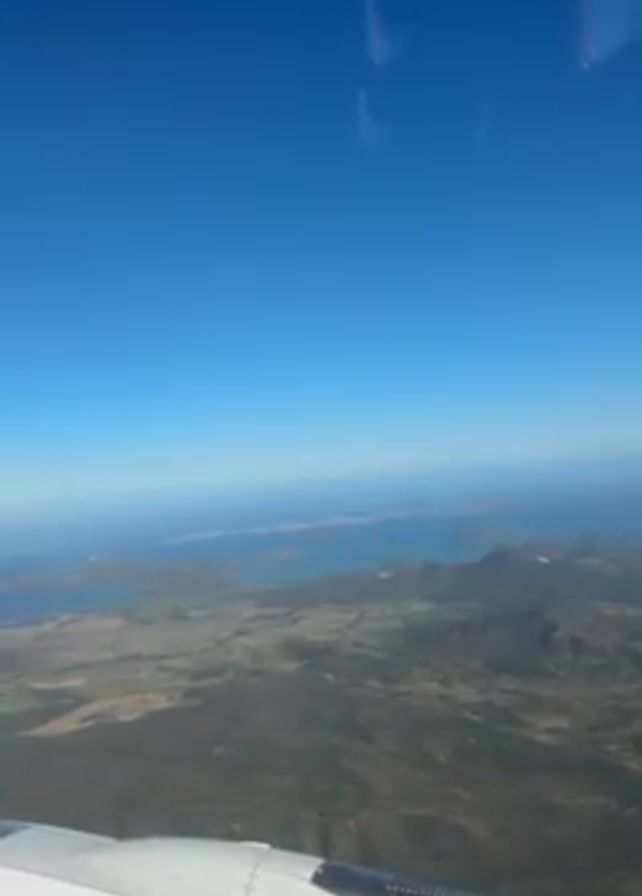 From an airplane window, a view of land with mountains and bodies of water under a clear, blue sky