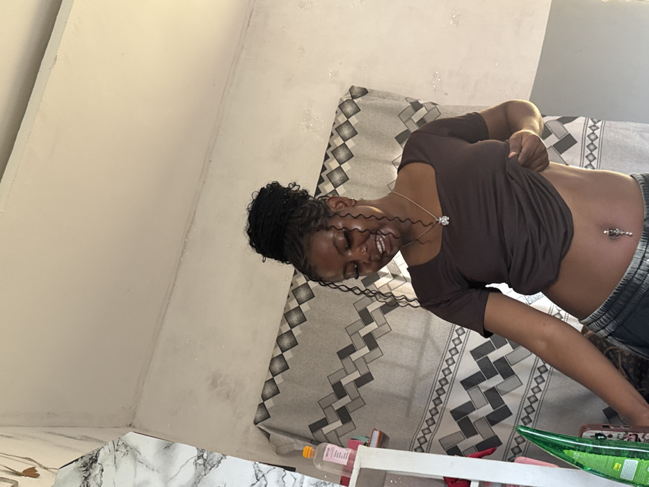 The scene is an interior room located in Asipa, Nigeria. A female subject, appearing to be in her late teens or early twenties, stands slightly angled towards the viewer. She has dark skin and dark braided hair, styled into a high bun with several loose, curly strands framing her face. She wears a dark brown, short-sleeved, square-neck top, which she lifts with her right hand to expose her midriff and a silver-colored navel piercing with dangling ornamentation. Dark-colored sweatpants are visible at her waist. She also wears a silver-colored necklace with a pendant, a nose stud, and small earrings. Her expression is a downward gaze accompanied by a smile. The background features a patterned curtain with a repeating gray geometric design covering the lower portion of the wall. The upper wall sections are light-colored with visible streaks and patches of discoloration. In the upper left corner, a section of wall exhibits a white and gray marble-like pattern. To the left of the subject, a white shelving unit is partially visible, holding a clear plastic bottle containing an orange liquid with a pink label, and a tall green translucent bottle on a lower shelf.