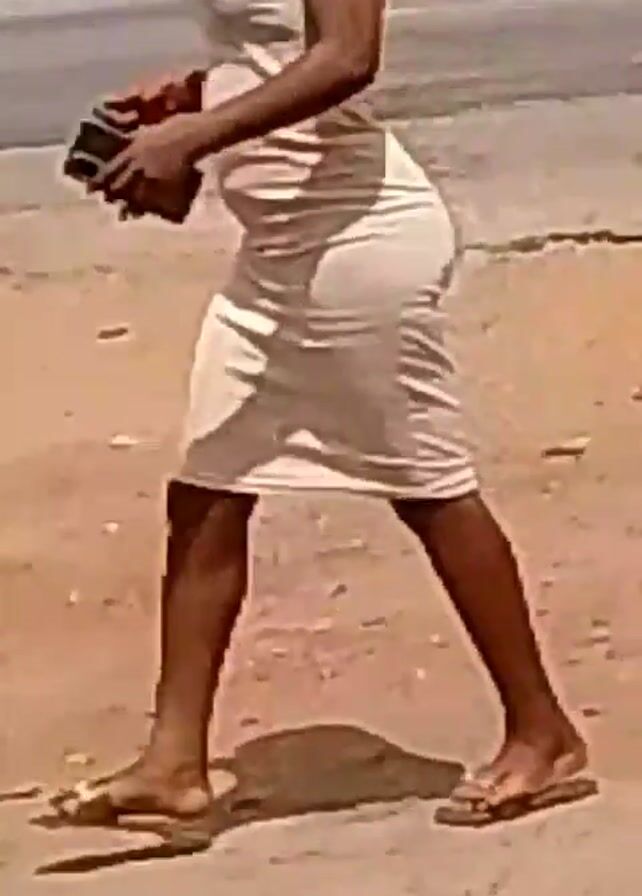 woman in a light-colored dress walking beside a road with cars and a tricycle in the background. She is carrying a dark object, possibly a phone or small wallet. She briefly raises her hand to her head while walking. The ground is sandy and appears somewhat dirty.
