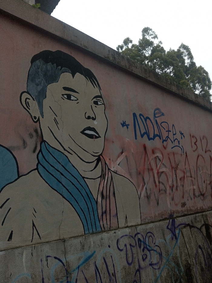 An outdoor scene in Laggala, Sri Lanka, displays a concrete retaining wall with multiple layers of artistic applications