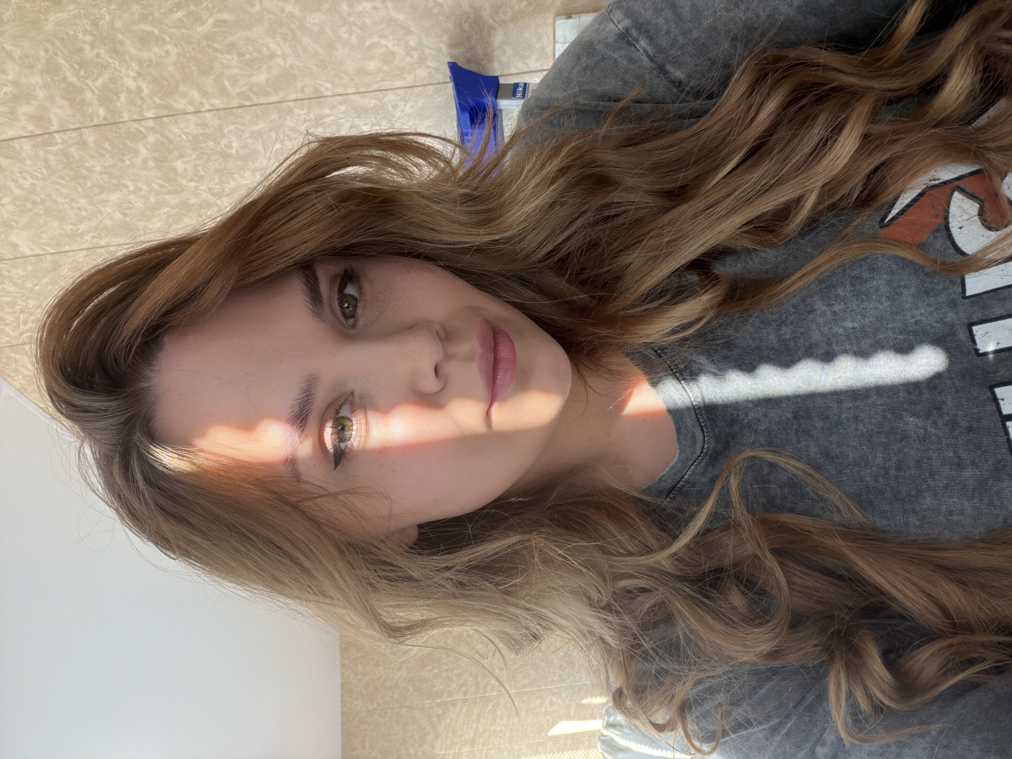 A selfie of a woman with long, wavy, light brown hair and fair skin. She is wearing a grey t-shirt. The background is a tiled floor and a white wall. A ray of sunshine falls across her face. The scene appears to be indoors, but the location is not evident from the image itself and cannot be ascertained as Chaikovsky, Russia.