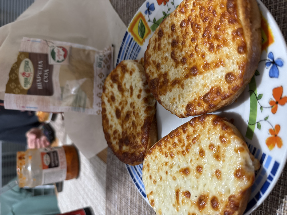 - "The image presents a close-up, slightly elevated view of three oval-shaped pieces of toast, each generously covered with melted, golden-brown cheese, arranged on a white ceramic plate" by FM-r9b3n2, licensed under CC BY 4.0