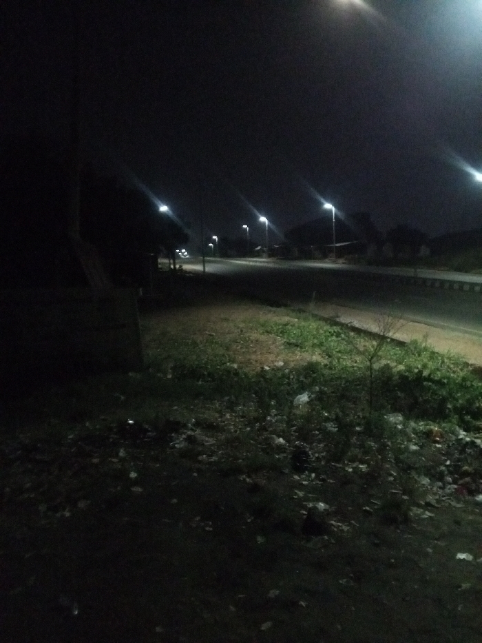 Night scene with a road illuminated by streetlights. A grassy shoulder and a pile of refuse are in the foreground. The sky is dark, and trees are visible along the roadside. The view is from a low angle, looking up towards the road.
