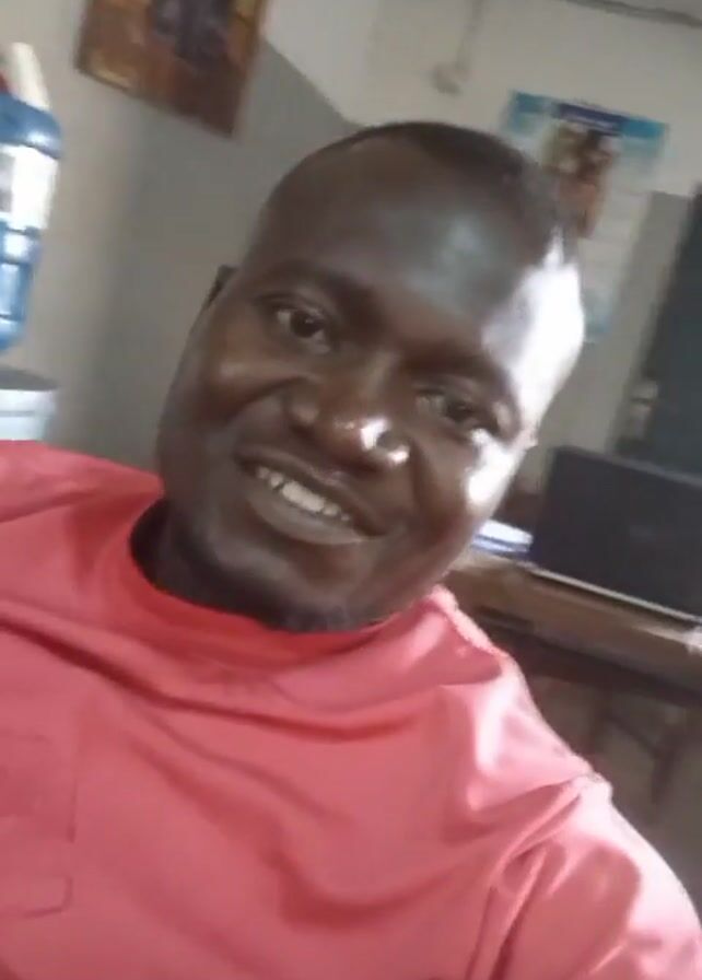 A man is recording a selfie-style video. He is wearing a red long-sleeved shirt. He is looking at the camera and smiling. He then makes a peace sign with his fingers. The background includes office furniture, a water cooler, and artwork on the wall. The lighting is bright.