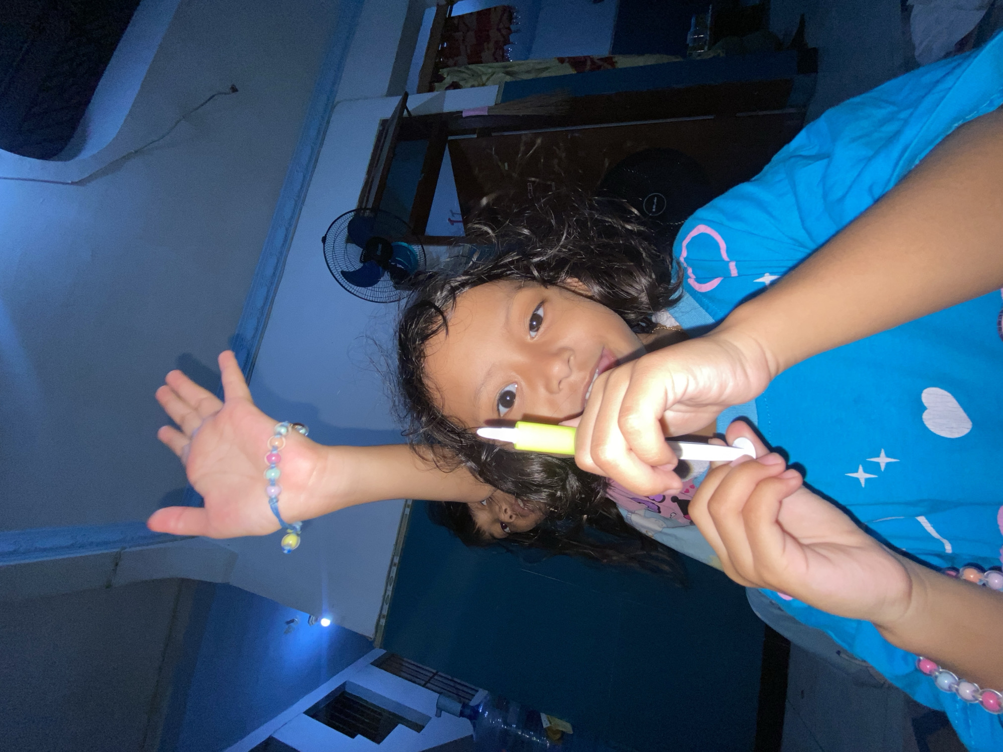 A child with curly dark hair is holding a yellow and white object near their mouth, possibly a marker or pen. The child is wearing a light blue t-shirt with white shapes printed on it. They have a beaded bracelet on one wrist and a similar bracelet on the other. The child is in a room with blue walls and a fan on the wall in the background. A second child is partially visible behind the first. Water bottles are visible on the floor. The photograph was taken indoors, likely in a home in Gelam, Indonesia.