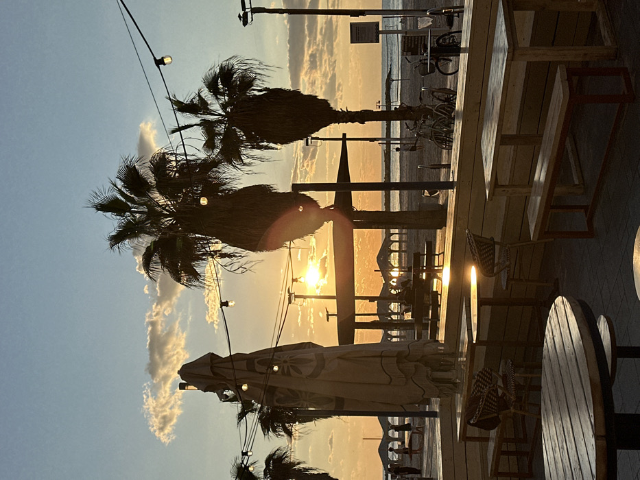 The image presents a beachfront scene at sunset, depicting a cafe area overlooking the Mediterranean Sea, located in Tel Aviv, Israel. The setting sun, a bright orange-yellow orb, is visible low on the horizon, creating strong backlighting and lens flare. In the immediate foreground on the left, a portion of a round wooden table with a slatted top is visible. The mid-foreground features an elevated wooden deck area containing several wooden tables and benches, along with a wicker-style chair. A large, closed beach umbrella, light-colored with a floral pattern, stands prominently on this deck. Overhead, a string of exposed light bulbs extends across the frame. The mid-ground is dominated by two tall palm trees with shaggy trunks, silhouetted against the bright sky and sunset. Beyond the deck, a sandy beach stretches towards the sea. Scattered individuals are present on the beach, appearing as dark silhouettes. Multiple open-sided pergolas with rounded roofs are visible along the beach, also silhouetted against the colorful sky. Several bicycles are parked on the right side of the beach area. The sea shows minimal wave activity, and a distant breakwater is discernible. The sky transitions from a light blue at the top to vibrant orange and yellow hues closer to the horizon, with scattered clouds reflecting the sunset.
