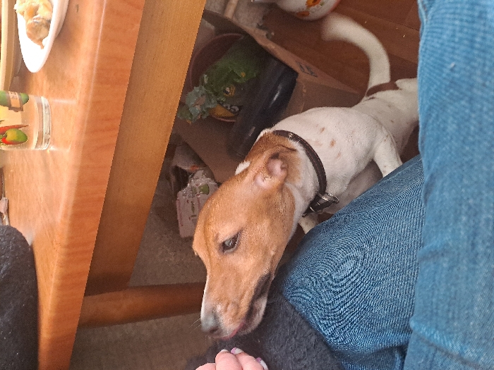 The scene is an indoor setting, located in Bolshaya Elhovka, Russia. The foreground shows the upper thighs and lap of an individual, clad in blue denim jeans. A hand, likely belonging to the individual, is partially visible on the upper left. A small, short-haired dog, primarily white with tan markings on its head and ears, and wearing a dark collar with a metal tag, is positioned on its hind legs. The dog leans against the person's left leg, its head turned to the left, and its tongue slightly extended towards the person's hand. A light brown wooden table occupies the mid-background. On the table, a clear glass with a multi-colored decorative design and a white plate containing food items are present. A dark, textured object is partially visible on the far left of the table surface. Beneath the table, on a light-colored floor, various objects are present: crumpled materials, a dark rectangular device, a small pot containing a green textured object, and a white ceramic decorative item with orange patterns.