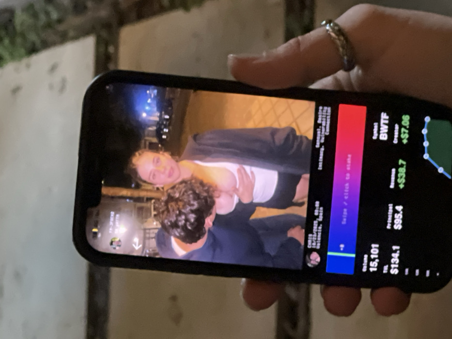 A close-up image depicts a person's light-toned hand holding a black smartphone vertically in an outdoor setting in Rishon LeZion, Israel, characterized by an out-of-focus concrete or paved ground in the background. The hand displays a silver-colored ring with a textured, possibly braided, design on the ring finger. The smartphone screen is illuminated, displaying a video or image with an accompanying interface. The central focus of the screen content is two individuals outdoors at night. A male individual, positioned on the left, has dark, curly hair and wears a dark long-sleeved garment. He is bent forward, his head close to the chest of the female individual. The female, positioned on the right, has light brown hair styled with a lighter section at the front. She wears a white tank top with her breasts partially exposed, a dark open jacket, and dark shorts. Her left hand is placed on her own exposed chest, appearing to support or hold her breasts, while her right hand is lightly placed on the male's head or upper back. She looks directly towards the camera with a neutral expression. The background of the scene on the phone screen shows a city street at night with streetlights, trees, and parked vehicles visible, illuminated by artificial light. Text overlay on the screen identifies the content creator as "CHRIS," captured on "10/23/2023, 00:00" in "Valencia, Spain." Additional tags include "Sensual, Desire, Intimacy, Vulnerability, Connection." Below the visual content, a user interface displays financial metrics: "Volume 15,101," "$134.1," "Principal $95.4," "Revenue +$38.7," "Symbol BWTF," and "Creator +$7.06," alongside a slider labeled "Swipe / click to stake" and a green line graph showing an upward trend.