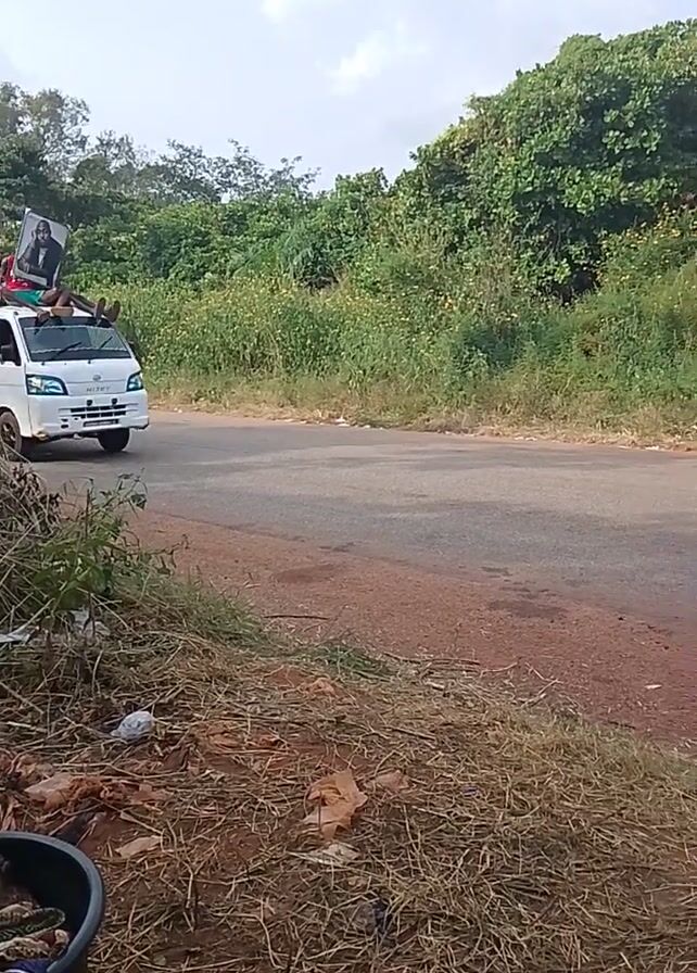 roadside scene with people and vehicles. The camera is oriented vertically. A small white truck initially appears, then a blue tuk-tuk follows. People are standing in the back of the white truck, and one appears to be holding a poster or sign. On the side of the road, a person is sitting next to a bowl of what looks like roasted nuts or seeds. A motorcycle with multiple people also appears with one individual holding a poster or sign. The environment consists of a paved road with grassy and bushy areas on either side, under a sky with scattered clouds.