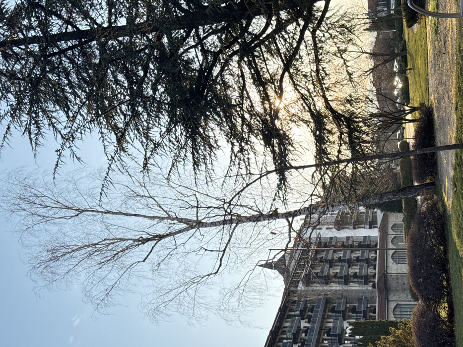 The image depicts an outdoor scene in Razliv, Bulgaria, under natural daylight, with the sun positioned low, suggesting either early morning or late afternoon. The foreground comprises a green grass lawn interspersed with dark-leafed shrubs and several smaller, leafless deciduous trees. A prominent, tall, slender deciduous tree with white bark and bare branches stands on the left, extending upwards against a light blue sky. To its right, a large conifer tree with dense, dark green needles occupies the right side of the frame, with the sun's glare visible through its branches. In the midground, behind the deciduous tree, a multi-story building with a light-toned facade is visible. This structure features numerous dark-railed balconies across its levels and a distinctive roofline with pointed architectural elements. The lower section of the building includes arched windows. In the background, a paved surface, likely a road, contains several parked or moving vehicles. No human figures or discernible activities are present.