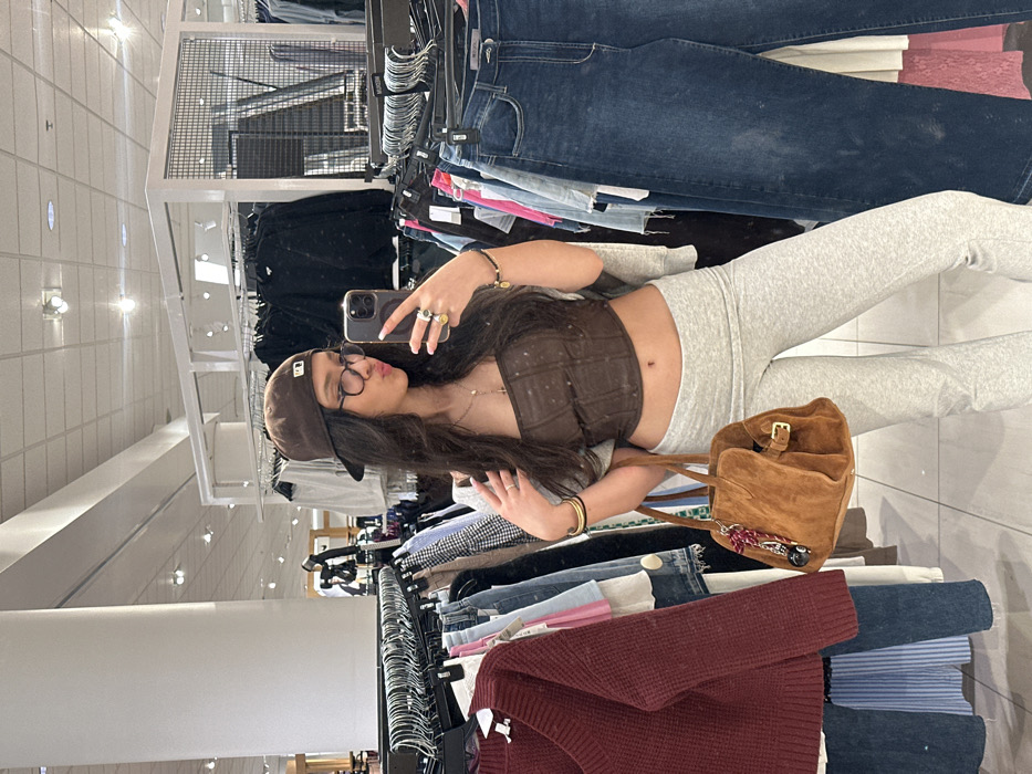 A female subject takes a mirror selfie within a retail clothing store, presumably located in Glendale, United States. She has long, dark, wavy hair, wears clear-framed glasses, and a brown baseball cap with a white stylized "NY" logo. Her attire consists of a dark brown corset-style crop top exposing her midriff, light grey high-waisted flared pants, and a light grey garment draped over her shoulders. She holds a dark smartphone in her right hand, displaying multiple rings and a dark beaded bracelet, while her left hand is positioned near her hair. Gold-colored bangles adorn her left wrist, and a delicate necklace with a small pendant is visible. She carries a light brown suede handbag featuring a buckle and a decorative charm. The background contains numerous clothing racks displaying various apparel, including a burgundy V-neck sweater and blue denim jeans. The store environment is illuminated by overhead fluorescent lighting and features white structural columns and metal grid display fixtures, indicative of a department store or large boutique.