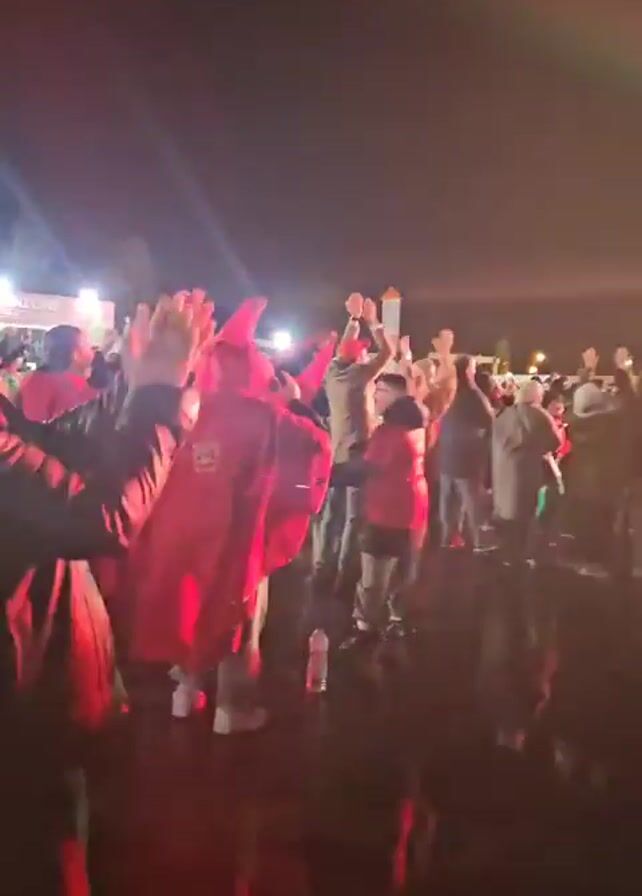 A crowd of people has gathered at an outdoor concert stage at night. Individuals are illuminated by the stage lights, which cast bright beams. Some people are wearing red clothing. People are cheering and holding up their hands in the air. The environment is dimly lit beyond the stage area. The ground appears wet.