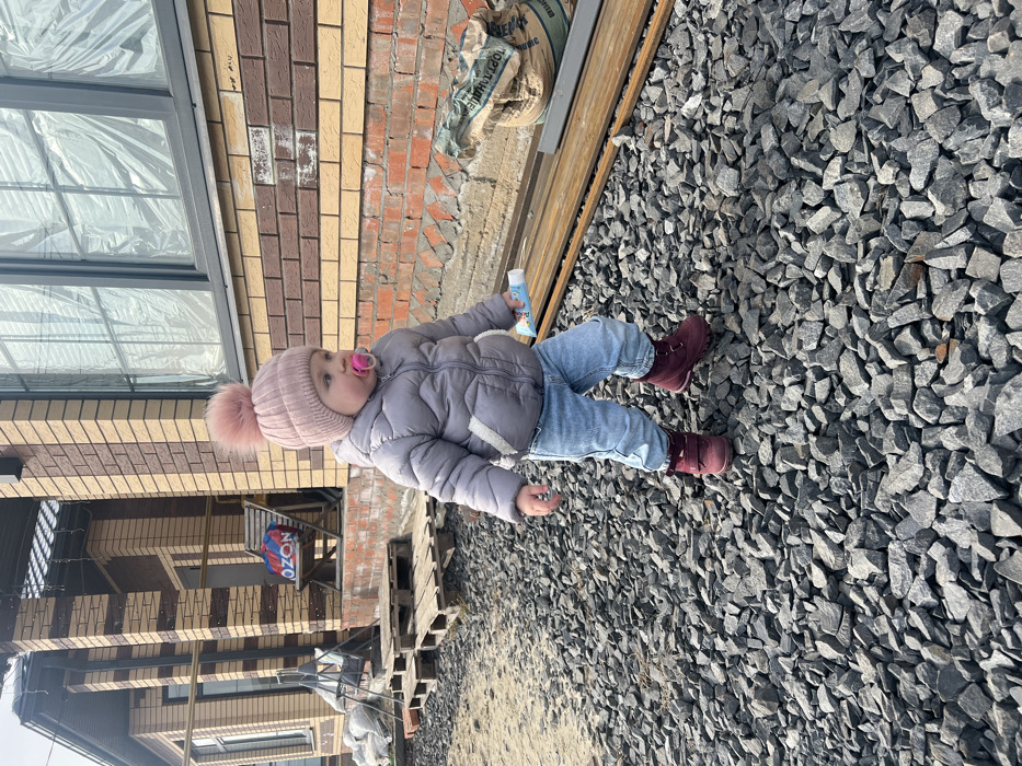 An infant, estimated between 1-2 years of age, stands centrally in an outdoor, gravel-covered area
