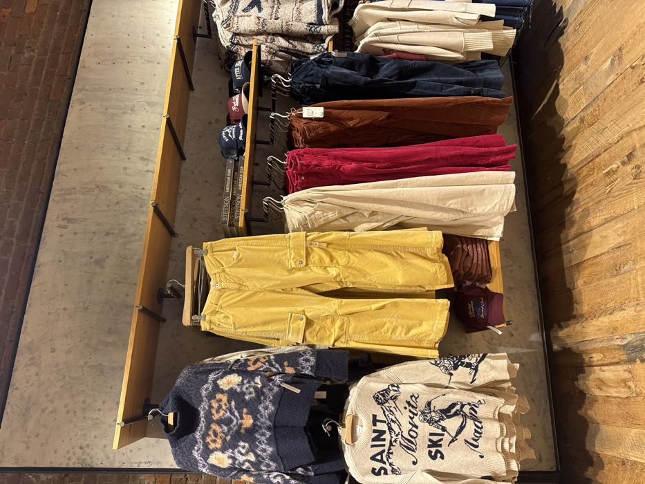 Clothes hang on a wooden and metal rack. A mix of sweaters and pants in various colors and textures are displayed. There are corduroy pants in yellow, beige, red, brown, and navy. Sweaters include patterns and text, "Saint Moritz Ski Academy". Branded items like hats are also on display, adding to the retail setting's assortment.