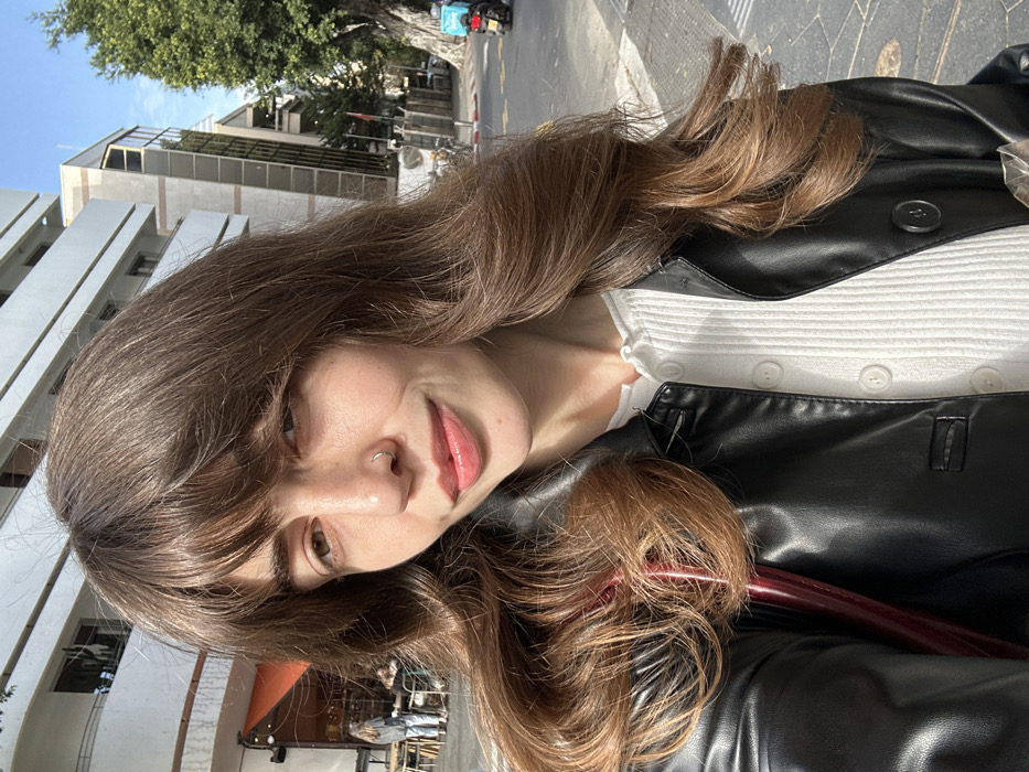 A female individual with long, wavy brown hair and bangs is captured in a sunlit selfie. She wears a black faux leather jacket over a white ribbed button-up top and has a silver ring on her left nostril. Her lips are lightly tinted, and her left eye is partially narrowed from direct sunlight. The scene is an urban street in Tel-Aviv, Israel. To her left, an outdoor cafe with an orange awning is visible, with several blurred figures seated at tables. Above the cafe, a light-colored building features multiple curvilinear balconies. To her right, a paved street shows a partially obscured two-wheeled delivery scooter with a blue box, modern buildings with glass facades, and trees with green foliage under a clear blue sky.