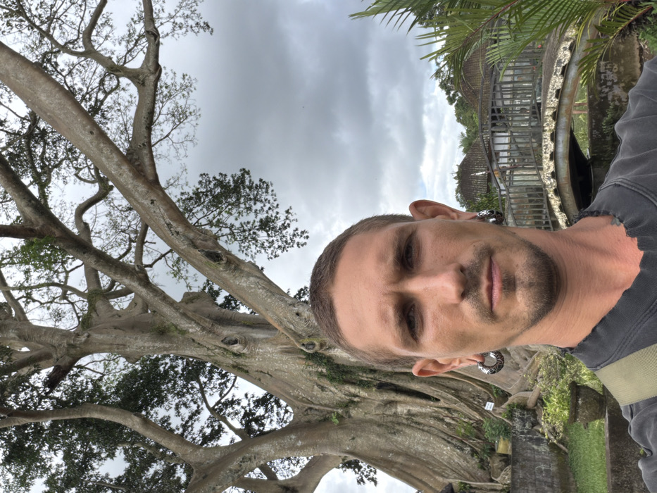 A male individual is centered in the foreground, looking directly at the camera. He has short, light brown hair, stubble, and wears a dark, distressed t-shirt with an olive-green strap over his left shoulder. Prominent silver-colored, intricately patterned circular ear gauges are visible in both earlobes. The background, set in Tua, Indonesia, is dominated on the left by a massive, ancient tree with a wide, textured trunk and numerous large branches extending towards an overcast sky. To the right, an arched bridge with metal railings crosses a body of water, leading to a cluster of traditional buildings with dark, tiered roofs. Green foliage, including palm fronds, is visible on the far right. The sky is grey and cloudy.
