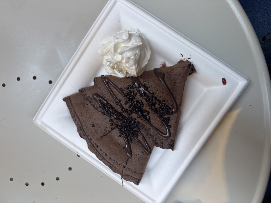 - "A chocolate crepe is displayed on a white square plate, topped with whipped cream, chocolate syrup, and black sprinkles" by FM-IdNfF2, licensed under CC BY 4.0
