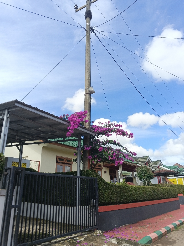 The scene depicts a residential street in ឃុំ ផាត់សណ្ដាយ, Cambodia, under a bright blue sky with scattered white cumulus clouds. A tall, grey concrete utility pole stands centrally, featuring multiple black electrical wires extending outwards, a dark, dense mass (possibly nesting material) near its top, and a small, light-colored fixture attached midway. In the immediate foreground on the left, a black metal gate with vertical bars is partially open, revealing a paved ground surface covered with scattered pink/magenta petals. A prominent bougainvillea bush with vibrant pink/magenta flowers cascades over a metallic-roofed carport structure and extends towards the utility pole. Behind the carport, a light cream-colored house with a green-tiled roof and brown wooden window frames is visible. A well-maintained green hedge runs along a low wall with a red top and grey base, separating the residences from the foreground. A paved sidewalk with a red and green striped curb is visible on the bottom right. Several other houses with green-tiled roofs are visible in the background along the street, set behind similar hedges and walls. No individuals or active subjects are present.