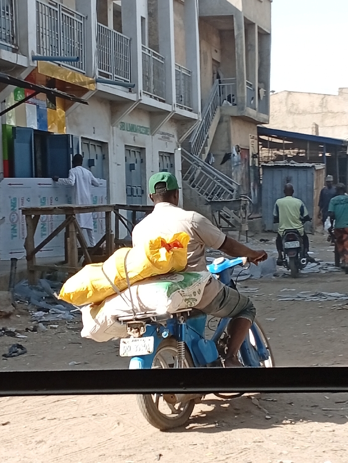 This image depicts a street scene in Kofar Ruwa, Nigeria, under bright daylight