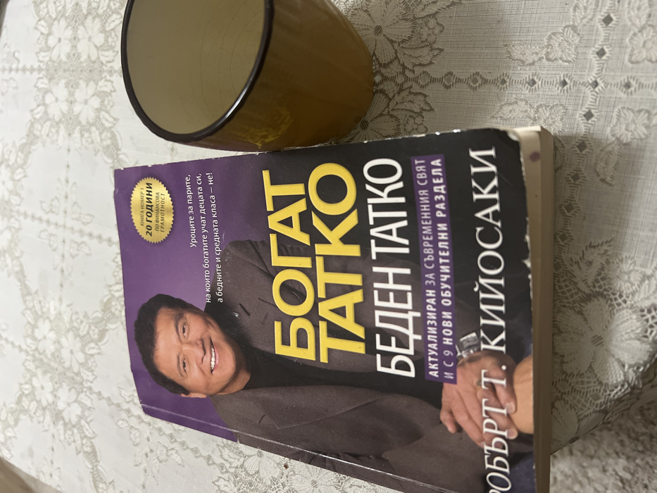 The scene is set indoors on a light-colored surface, specifically a tablecloth or placemat featuring a subtle white or off-white floral lace pattern. Located in Byal Izvor, Bulgaria, the primary subject is a copy of the book "Богат Татко Беден Татко" (Rich Dad Poor Dad), prominently displayed in the foreground and slightly to the left of center. The book cover is purple, featuring a smiling Asian male identified as Robert T. Kiyosaki. The title text is in bold yellow. To the right of the book, a single, plain, mustard-yellow or light brown mug with a dark brown rim is present, positioned upright. No individuals are depicted within the frame. The overall lighting is even.