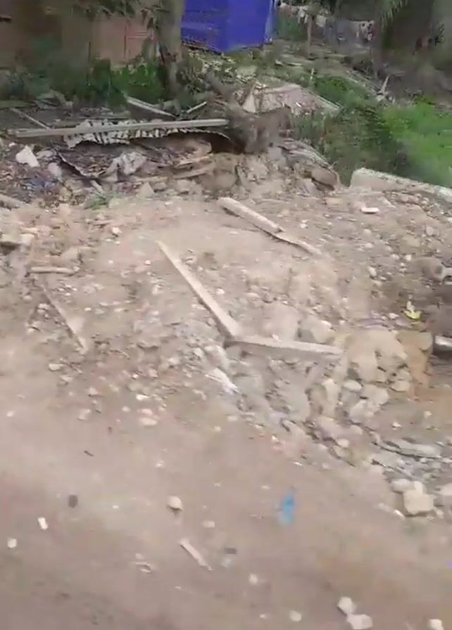 dirt road, alongside a construction area with scrap metal, wood, and debris scattered around