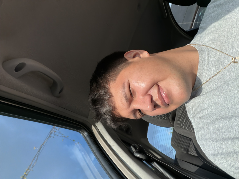 A person with short dark hair and a gold chain necklace is inside a car. The individual is wearing a gray shirt and has a seatbelt on. The window shows a blue sky with some plants visible outside. The interior of the car is visible, including the ceiling, a passenger handle, and the window frame. The person's eyes are partially closed with a slight smile.
