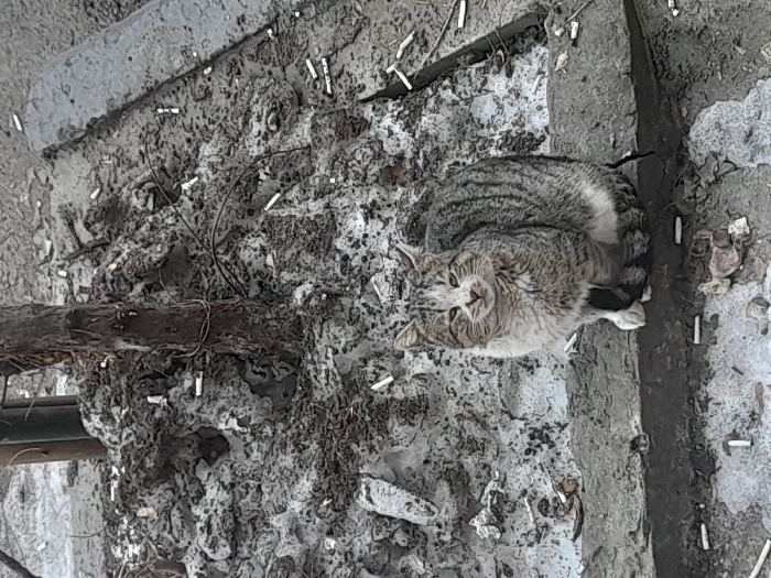 - "A tabby cat lies on a dirty, cracked concrete surface scattered with cigarette butts" by FM-iphKu2, licensed under CC BY 4.0