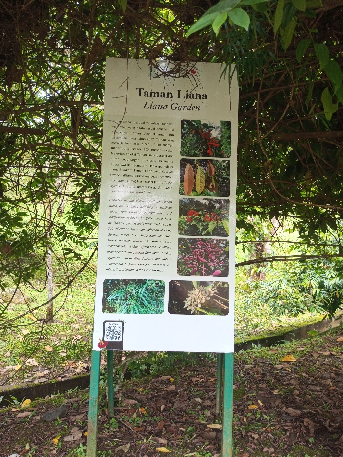 This image presents an outdoor scene centered on a vertical, white informational sign for the 'Taman Liana' (Liana Garden)