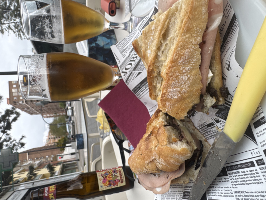 An outdoor cafe table, possibly in an urban area of Valencia, Spain, is set with food and beverages