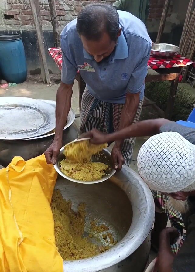 Two middle-aged men are outdoors preparing food. One man, wearing a blue polo shirt and a plaid sarong, holds a silver bowl filled with yellow food, transferring it into a large silver pot. The pot is nearly full of the same yellow substance. The second man, wearing a white patterned skullcap and a plaid sarong, uses a white spatula to mix the food in the pot. A large yellow cloth rests on the edge of the pot. A blue barrel and other pots and pans are visible in the background. The location seems to be in a courtyard or backyard, judging by the brick wall and partial views of a shed. A third man is visible in the background, standing near a small table covered with a red-and-white checkered cloth.