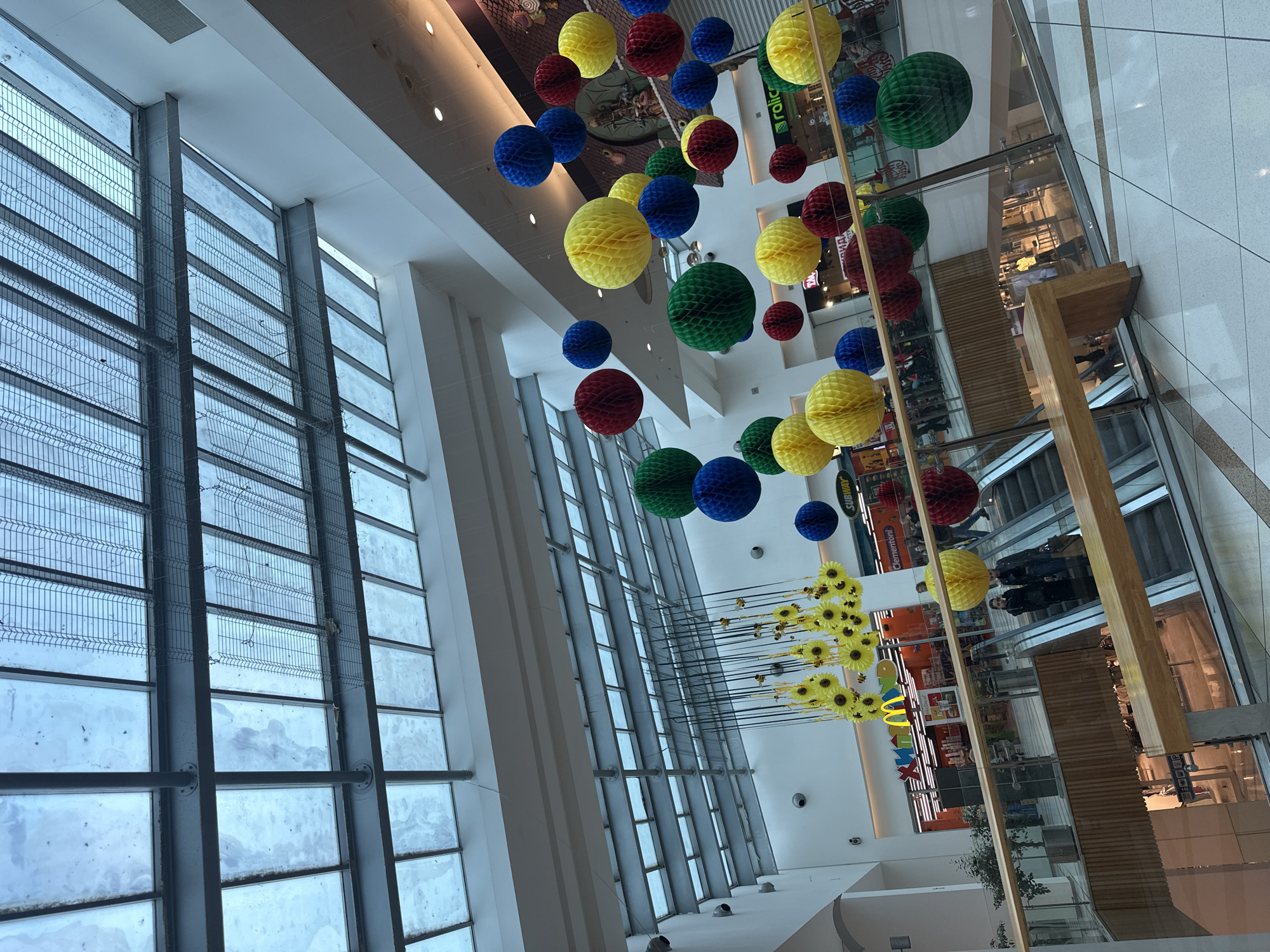 interior of a shopping mall in Varna, Bulgaria. Large windows line one side, with a metallic grid overlaying the glass. Hanging from the ceiling are colorful paper honeycomb decorations in blue, yellow, red, and green. In the background, there are several sunflower decorations in the mall. An escalator can be seen with a small number of people. The floor is tiled. The image is taken from a low angle, looking up.