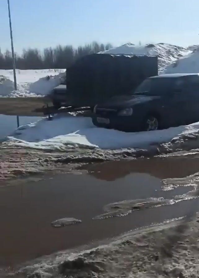 muddy, slushy parking lot on a sunny day. There is a large puddle of water in the center of the lot, with tire tracks visible through the mud and slush. Several cars are parked in the lot, some covered in dirt. In the background, there is a large building and a pile of snow. A white van drives through the puddle, splashing water. A tow rope is visible laying in the puddle. The camera pans to show more cars parked in the lot.