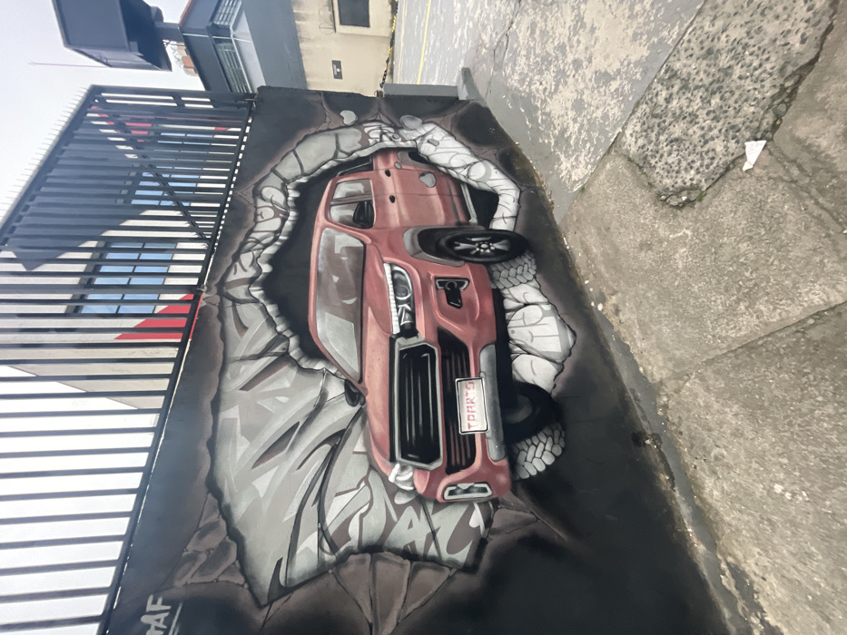 A forensic, matter-of-fact description of the image reveals an outdoor urban scene featuring a large mural on a building wall